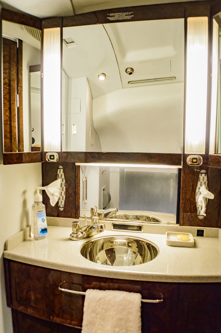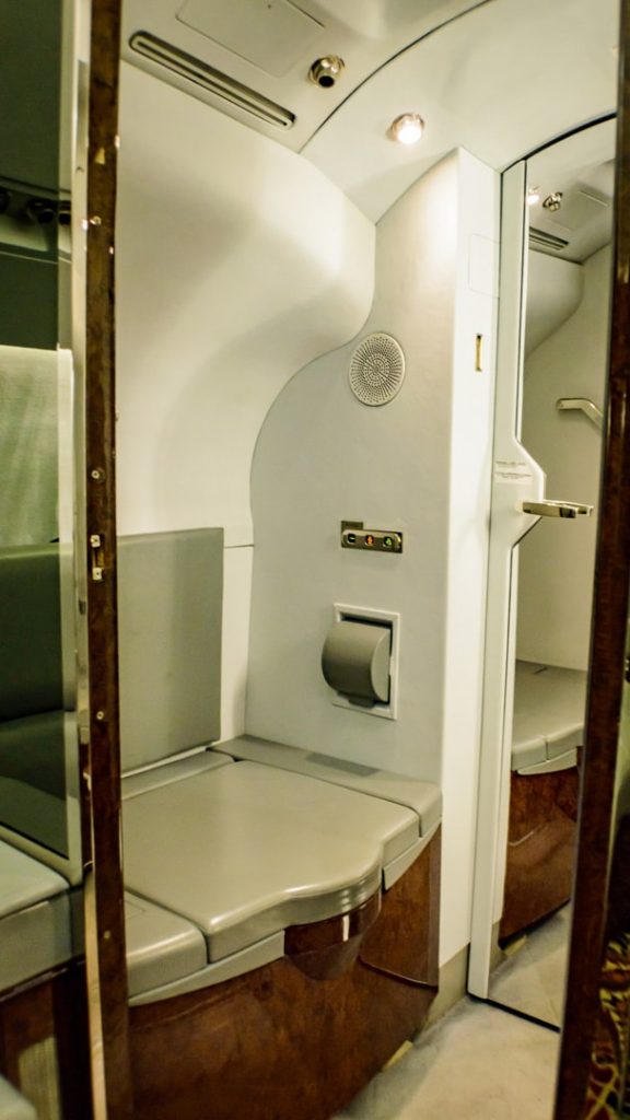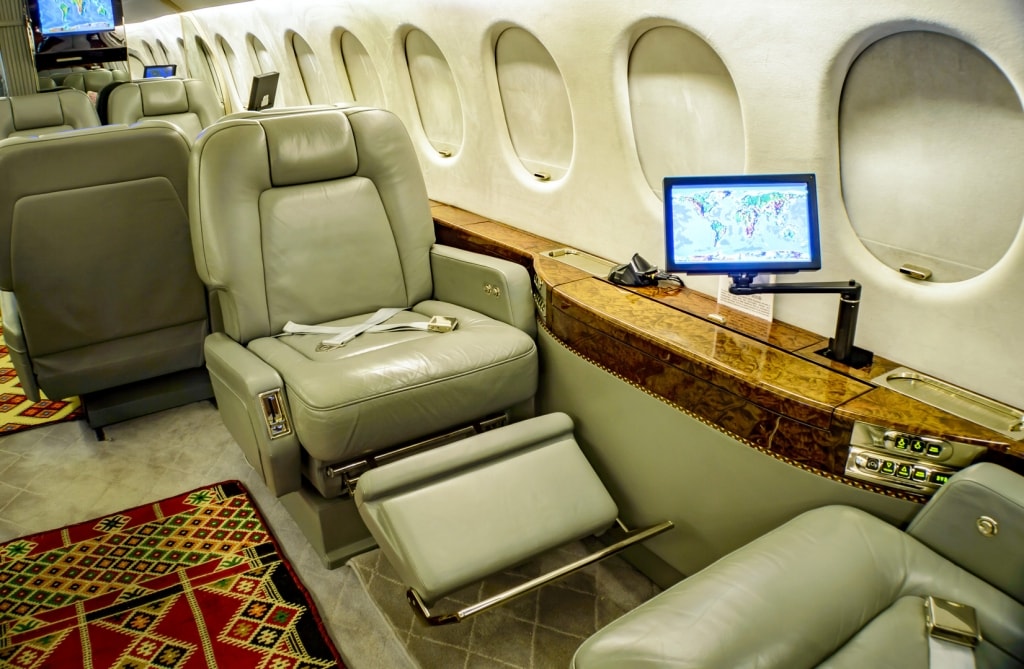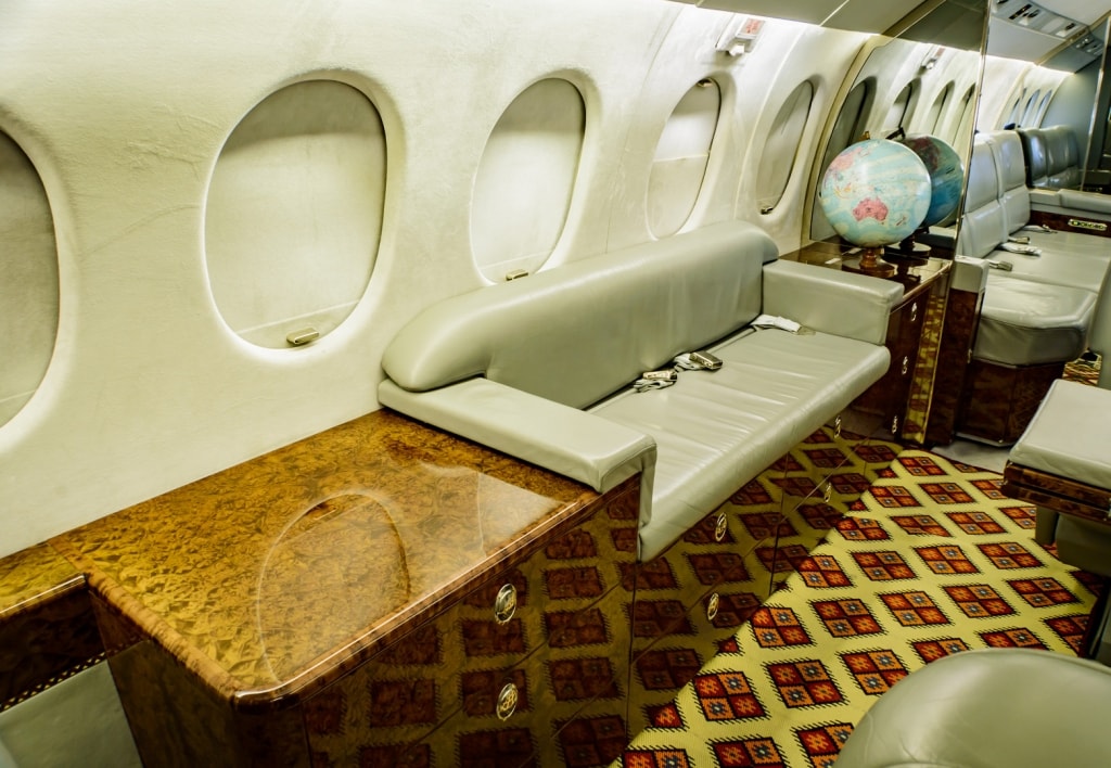 Fourteen passenger executive configuration consisting of a forward four place club, a mid cabin four place dining group opposite to a credenza and two aft divan for three passengers each. Front Jumpseat. Forward & aft lavatory. Entertainment includes Airshow 400, VHS,DVD and CD player. Four 8” side edge monitors and two 22” LCD monitors.